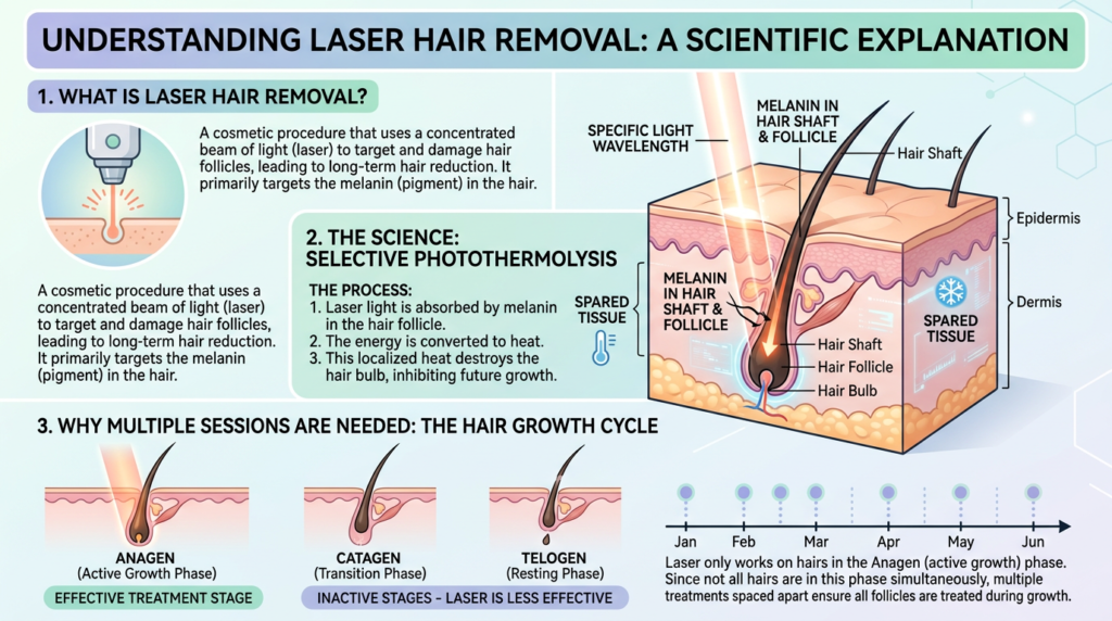 Hair grows in three distinct phases: anagen (active growth), catagen (transition), and telogen (resting). Laser hair removal only works on hair that’s actively growing, which represents about 20-30% of your hair at any given time.